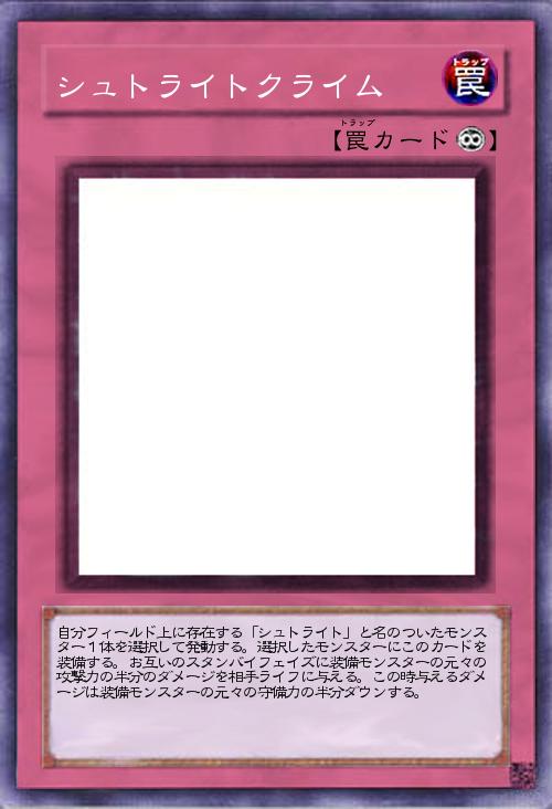 | 自分フィールド上に存在する「シュトライト」と名のついたモンスター1体を選択して発動する。選択したモンスターにこのカードを装備する。お互いのスタンバイフェイズに装備モンスターの元々の攻撃力の半分のダメージを相手ライフに与える。この時与えるダメージは装備モンスターの元々の守備力の半分ダウンする。 | |||