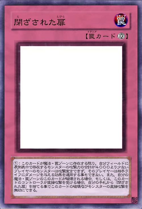 | ①:このカードが魔法・罠ゾーンに存在する限り、自分フィールドに表側表示で存在するモンスターの攻撃力の合計が4000より少ないプレイヤーのモンスターは攻撃宣言できず、そのプレイヤーは相手ライフにダメージを与える効果を適用する事もできない。また、自分の魔法・罠ゾーンのこのカードが破壊される場合、もしくは、このカードのコントローラが直接攻撃を受ける場合、自分の手札から「閉ざされた扉」を捨てる事でこのカードの破壊及びモンスターの直接攻撃を無効にできる。 | |||