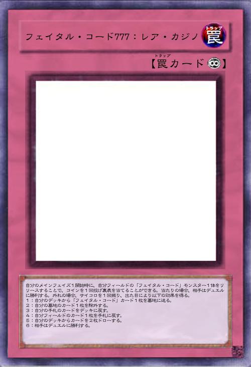 | 自分のメインフェイズ1開始時に、自分フィールドの「フェイタル・コード」モンスター1体をリリースすることで、コインを1回投げ裏表を当てることができる。当たりの場合、相手はデュエルに勝利する。外れの場合、サイコロを1回振り、出た目により以下の効果を得る。 1:自分のデッキから「フェイタル・コード」カード1枚を墓地に送る。 2:自分の墓地のカード1枚を除外する。 3:自分の手札のカードをデッキに戻す。 4:自分フィールドのカード1枚を手札に戻す。 5:自分のデッキからカードを2枚ドローする。 6:相手はデュエルに勝利する。 | |||