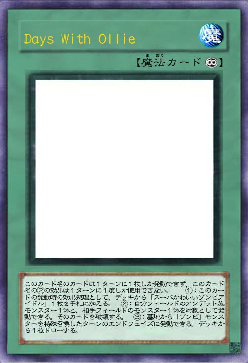 | このカード名のカードは1ターンに1枚しか発動できず、このカード名の②の効果は1ターンに1度しか使用できない。 ①:このカードの発動時の効果処理として、デッキから「スーパかわいいゾンビアイドル」1枚を手札に加える。 ②:自分フィールドのアンデット族モンスター1体と、相手フィールドのモンスター1体を対象として発動できる。そのカードを破壊する。 ③:墓地から「ゾンビ」モンスターを特殊召喚したターンのエンドフェイズに発動できる。デッキから1枚ドローする。 | |||
