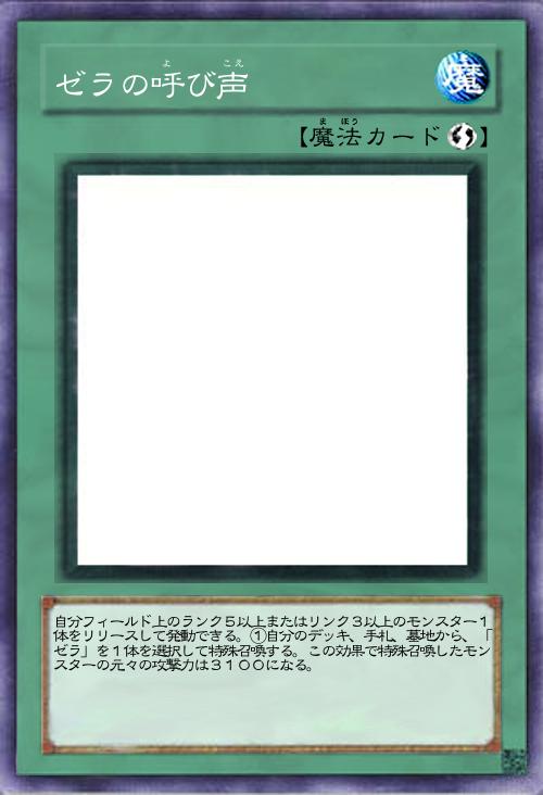 | 自分フィールド上のランク5以上またはリンク3以上のモンスター1体をリリースして発動できる。①自分のデッキ、手札、墓地から、「ゼラ」を1体を選択して特殊召喚する。この効果で特殊召喚したモンスターの元々の攻撃力は3100になる。 | |||