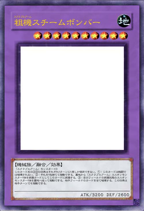 | 「スクラプルアーム」モンスター×3 このカード名の②③の効果はそれぞれ1ターンに1度しか使用できない。①:このカードは戦闘では破壊されない。②:手札を1枚捨てて発動できる。墓地から「スクラプルアーム」ユニオンモンスター1体を装備カードとしてこのカードに装備する。③:自分フィールドの装備状態のユニオンモンスター1体を墓地へ送って発動できる。相手フィールドのカードを全て破壊する。この効果は相手ターンでも発動できる。 | |||
