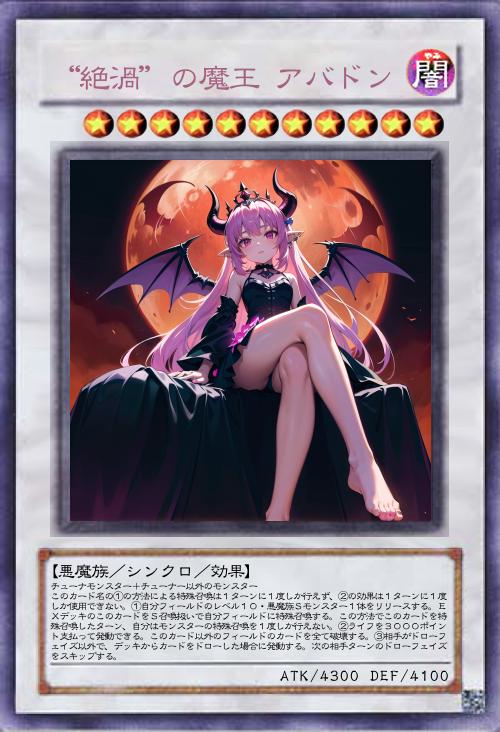 | チューナモンスター+チューナー以外のモンスター このカード名の①の方法による特殊召喚は1ターンに1度しか行えず、②の効果は1ターンに1度しか使用できない。①自分フィールドのレベル10・悪魔族Sモンスター1体をリリースする。EXデッキのこのカードをS召喚扱いで自分フィールドに特殊召喚する。この方法でこのカードを特殊召喚したターン、自分はモンスターの特殊召喚を1度しか行えない。②ライフを3000ポイント支払って発動できる。このカード以外のフィールドのカードを全て破壊する。③相手がドローフェイズ以外で、デッキからカードをドローした場合に発動する。次の相手ターンのドローフェイズをスキップする。 | |||