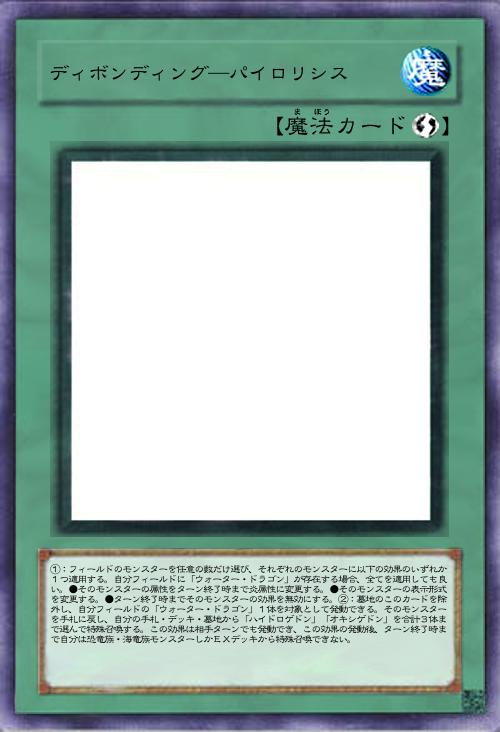 | ①:フィールドのモンスターを任意の数だけ選び、それぞれのモンスターに以下の効果のいずれか1つ適用する。自分フィールドに「ウォーター・ドラゴン」が存在する場合、全てを適用しても良い。●そのモンスターの属性をターン終了時まで炎属性に変更する。●そのモンスターの表示形式を変更する。●ターン終了時までそのモンスターの効果を無効にする。②:墓地のこのカードを除外し、自分フィールドの「ウォーター・ドラゴン」1体を対象として発動できる。そのモンスターを手札に戻し、自分の手札・デッキ・墓地から「ハイドロゲドン」「オキシゲドン」を合計3体まで選んで特殊召喚する。この効果は相手ターンでも発動でき、この効果の発動後、ターン終了時まで自分は恐竜族・海竜族モンスターしかEXデッキから特殊召喚できない。 | |||