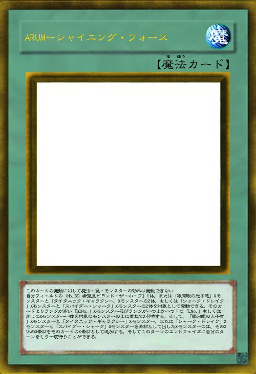 | このカードの発動に対して魔法・罠・モンスターの効果は発動できない 自分フィールドの「No.39 希望皇ビヨンド・ザ・ホープ」1体、または「銀河眼の光子竜」Xモンスターと「タイタニック・ギャラクシー」Xモンスターの2体、もしくは「シャーク・ドレイク」Xモンスターと「スパイダー・シャーク」Xモンスターの2体を対象として発動できる。そのカードよりランクが高い「SCNo.」Xモンスター及びランクが一つ上か一つ下の「CNo.」もしくは同じのXモンスター一体を対象のモンスターの上に重ねてX召喚する。そして、「銀河眼の光子竜」Xモンスターと「タイタニック・ギャラクシー」Xモンスター、または「シャーク・ドレイク」Xモンスターと「スパイダー・シャーク」Xモンスターを素材として出したXモンスターのは、その2体のX素材をそのカードのX素材として追加する。そしてこのターンのエンドフェイズに自分のターンをもう一度行うことができる。 | |||