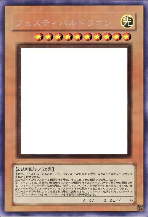 | ①自分フィールドに「フェスティバル」モンスターが存在する場合、このカードはリリース無しで手札から召喚できる。 ②このカードがモンスターと戦闘を行う場合、その2体はその戦闘では破壊されない。 ③1ターンに1度、自分の幻想魔族モンスターが戦闘を行ったダメージステップ終了時に発動できる。フィールドのカード1枚を破壊し、相手に1000ポイントのダメージを与える。その後、自分フィールドの「フェスティバル」モンスター1体の攻撃力・守備力を1000アップできる。 ④このカードが効果によって破壊された場合に発動できる。このターンに破壊されたこのカード以外の「フェスティバル」モンスター1体を守備表示で特殊召喚する。 | |||