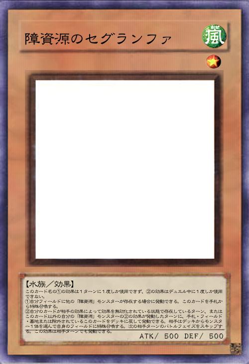 | このカード名の①の効果は1ターンに1度しか使用できず、②の効果はデュエル中に1度しか使用できない。 ①自分フィールドに他の「障資源」モンスターが存在する場合に発動できる。このカードを手札から特殊召喚する。 ②自分のカードが相手の効果によって効果を無効化されている状態で存在しているターン、またはこのカード以外の自分の「障資源」モンスターの②の効果が発動したターンに、手札・フィールド・墓地または除外されているこのカードをデッキに戻して発動できる。相手はデッキからモンスター1体を選んで自身のフィールドに特殊召喚する。次の相手ターンのバトルフェイズをスキップする。この効果は相手ターンでも発動できる。 | |||