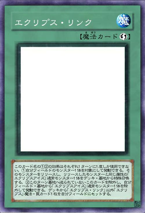 | このカード名の①②の効果はそれぞれ1ターンに1度しか使用できない。①自分フィールドのモンスター1体を対象にして発動できる。そのモンスターをリリースし、リリースしたモンスターと同じ属性の「エクリプスアイズ」通常モンスター1体をデッキ・墓地から特殊召喚する。②このターン墓地へ送られていないこのカードを除外し、自分フィールド・墓地から「エクリプスアイズ」通常モンスター1体を除外して発動できる。デッキから「エクリプス・リンク」以外「エクリプス」魔法・罠カード1枚を自分フィールドにセットする。 | |||