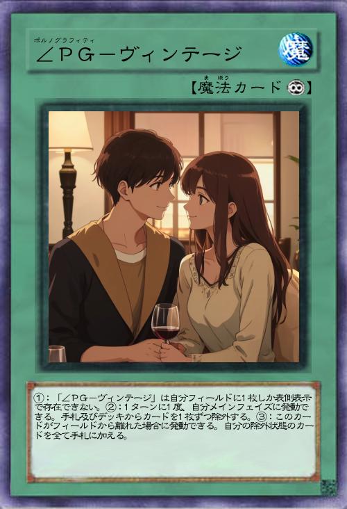 | ①:「∠PG-ヴィンテージ」は自分フィールドに1枚しか表側表示で存在できない。②:1ターンに1度、自分メインフェイズに発動できる。手札及びデッキからカードを1枚ずつ除外する。③:このカードがフィールドから離れた場合に発動できる。自分の除外状態のカードを全て手札に加える。 | |||