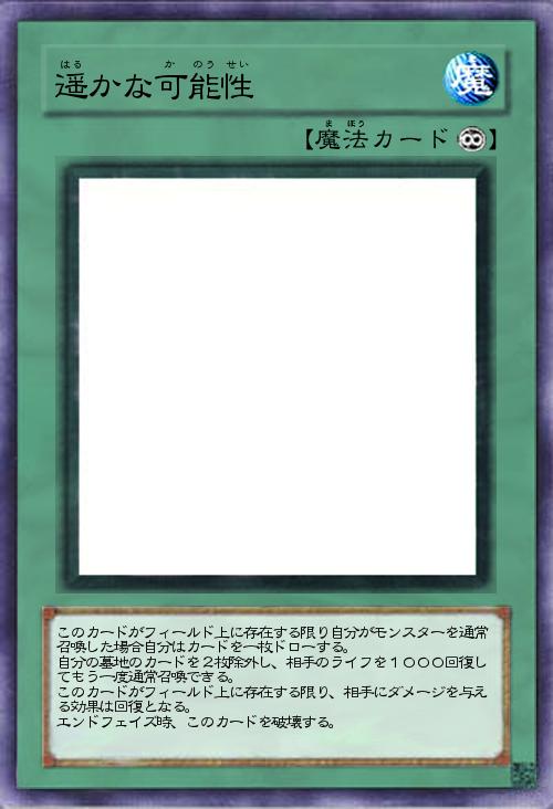 このカードがフィールド上に存在する限り自分がモンスターを通常召喚した場合自分はカードを一枚ドローする。 自分の墓地のカードを2枚除外し、相手のライフを1000回復してもう一度通常召喚できる。 このカードがフィールド上に存在する限り、相手にダメージを与える効果は回復となる。 エンドフェイズ時、このカードを破壊する。 |
