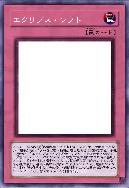 | このカード名の①②の効果はそれぞれ1ターンに1度しか使用できない。相手がモンスターを召喚・特殊召喚した場合に発動できる。手札・墓地から「エクリプスアイズ」通常モンスター1体を特殊召喚する。②自分フィールドのモンスターが攻撃対象に選択された時に墓地のこのカードを除外して発動できる。攻撃対象に選択されたモンスターを手札に戻し、墓地・除外状態の「エクリプスアイズ」通常モンスター1体を特殊召喚する。その後、攻撃対象をこの効果で特殊召喚したモンスターに移し替えてダメージ計算を行う。 | |||