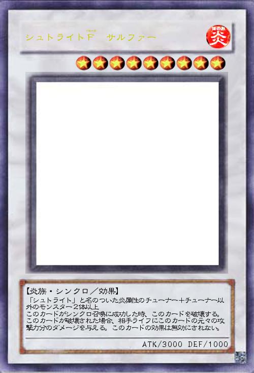 「シュトライト」と名のついた炎属性のチューナー+チューナー以外のモンスター2体以上 このカードがシンクロ召喚に成功した時、このカードを破壊する。このカードが破壊された場合、相手ライフにこのカードの元々の攻撃力分のダメージを与える。このカードの効果は無効にされない。 |