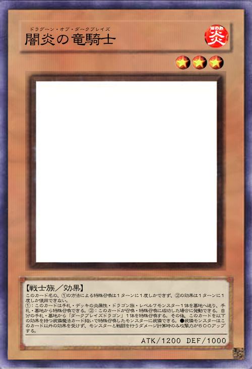 | このカード名の、①の方法による特殊召喚は1ターンに1度しかできず、②の効果は1ターンに1度しか使用できない。 ①:このカードは手札・デッキの炎属性・ドラゴン族・レベル7モンスター1体を墓地へ送り、手札・墓地から特殊召喚できる。②:このカードが召喚・特殊召喚に成功した場合に発動できる。自分の手札・墓地から「ダークブレイズドラゴン」1体を特殊召喚する。その後、このカードを以下の効果を持つ装備魔法カード扱いで特殊召喚したモンスターに装備できる。●装備モンスターはこのカード以外の効果を受けず、モンスターと戦闘を行うダメージ計算時のみ攻撃力が600アップする。 | |||