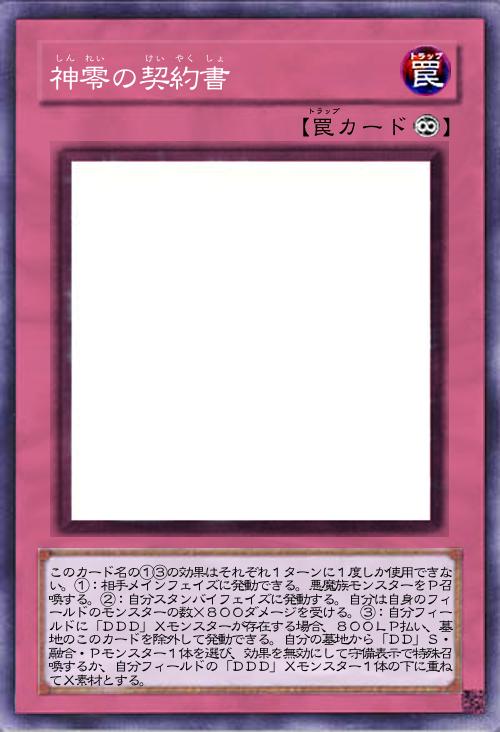 | このカード名の①③の効果はそれぞれ1ターンに1度しか使用できない。①:相手メインフェイズに発動できる。悪魔族モンスターをP召喚する。②:自分スタンバイフェイズに発動する。自分は自身のフィールドのモンスターの数×800ダメージを受ける。③:自分フィールドに「DDD」Xモンスターが存在する場合、800LP払い、墓地のこのカードを除外して発動できる。自分の墓地から「DD」S・融合・Pモンスター1体を選び、効果を無効にして守備表示で特殊召喚するか、自分フィールドの「DDD」Xモンスター1体の下に重ねてX素材とする。 | |||