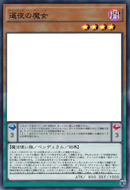 | このカード名の(1)のP効果は1ターンに1度しか発動できない。 (1):このカード名以外の「ナイトルーム」カードの効果の発動に対して発動できる。Pゾーンのこのカードを特殊召喚する。 (2):自分フィールドの「ナイトルーム」モンスターは相手の発動した魔法カードの効果を受けない。 | |||