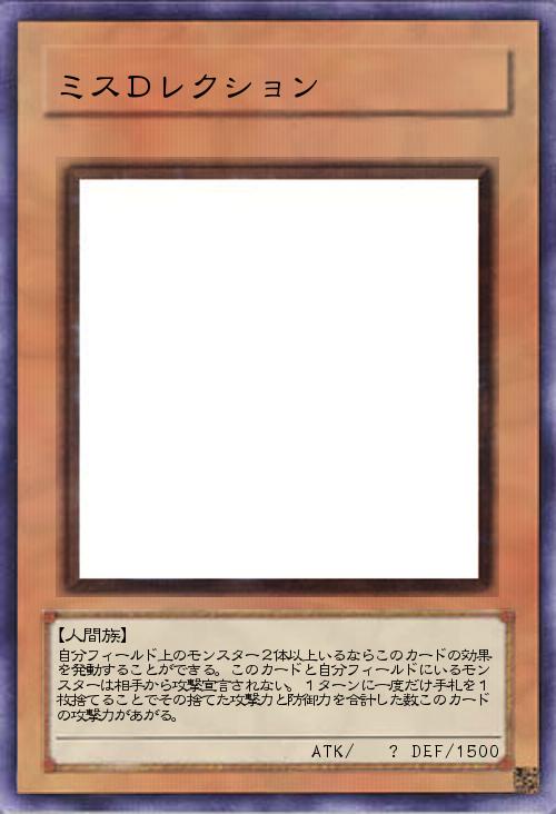| 自分フィールド上のモンスター2体以上いるならこのカードの効果を発動することができる。このカードと自分フィールドにいるモンスターは相手から攻撃宣言されない。1ターンに一度だけ手札を1枚捨てることでその捨てた攻撃力と防御力を合計した数このカードの攻撃力があがる。 | |||