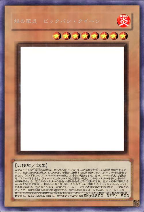 | このカード名の①③④の効果は、それぞれ1ターンに1度しか使用できず、この効果を使用するターン、自分はLP回復効果か、LPが回復した場合に発動する効果を持つモンスターしか特殊召喚できない。①いずれかのプレイヤーのLPが回復した場合に発動できる。自分フィールド上の炎属性モンスター1体を含む、フィールド上のカード2枚を墓地へ送り、このモンスターを手札・除外から特殊召喚する。②このモンスターの召喚・特殊召喚成功時に発動できる。自分・相手の墓地からカードを3枚まで除外し、除外した数と同じ数、自分のデッキ・墓地から「レッド・ポーション」を手札に加える。③このモンスターが自分フィールド上に既に表側で存在する状態で、いずれかのプレイヤーのLPが回復した場合に発動できる。相手に1500のダメージを与え、フィールド上のカードを3枚まで選んで破壊する。④このモンスターがフィールド上から墓地へ送られた場合に発動できる。お互いに1000LP回復し、自分はデッキから1枚ドローする。 | |||