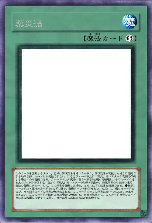 | このカードを発動するターン、自分は回復効果を持つカードか、回復効果が発動した場合に発動できる効果を持つカードしか発動できない。①自分フィールド上に「薬災」モンスターが表側で存在する場合にのみ発動できる。フィールド上の魔法・罠カードを1枚選んで破壊し、そのカードの持ち主のLPは800回復する。自分の「薬災」モンスターの効果の発動か、回復効果のみを持つ通常魔法の発動にチェーンして、この効果を発動した場合、さらに以下の効果を適用できる。●相手フィールド上・墓地のカードを1枚ずつ選ぶ。発動ターンの終了時まで、お互いに、選んだカードおよび、その同名カードの効果が無効化される。このカード名のこの効果は1ターンに1度しか適用できない。②このカードが除外された場合に発動する。自分の除外から、このカードを含むカードを任意の数選んでデッキに戻し、自分は戻した数×100LPを回復する。 | |||