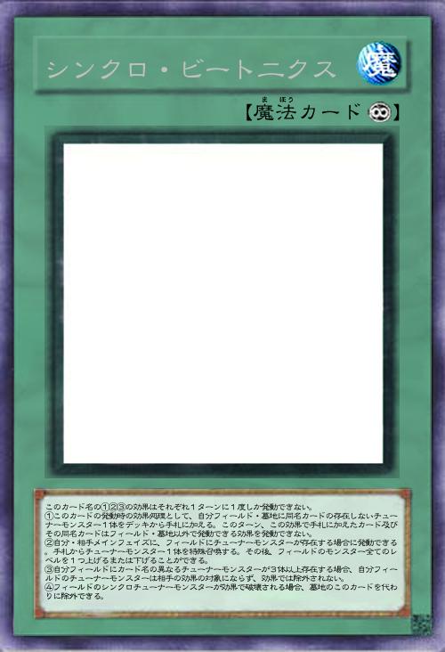 | このカード名の①②③の効果はそれぞれ1ターンに1度しか発動できない。 ①このカードの発動時の効果処理として、自分フィールド・墓地に同名カードの存在しないチューナーモンスター1体をデッキから手札に加える。このターン、この効果で手札に加えたカード及びその同名カードはフィールド・墓地以外で発動できる効果を発動できない。 ②自分・相手メインフェイズに、フィールドにチューナーモンスターが存在する場合に発動できる。手札からチューナーモンスター1体を特殊召喚する。その後、フィールドのモンスター全てのレベルを1つ上げるまたは下げることができる。 ③自分フィールドにカード名の異なるチューナーモンスターが3体以上存在する場合、自分フィールドのチューナーモンスターは相手の効果の対象にならず、効果では除外されない。 ④フィールドのシンクロチューナーモンスターが効果で破壊される場合、墓地のこのカードを代わりに除外できる。 | |||