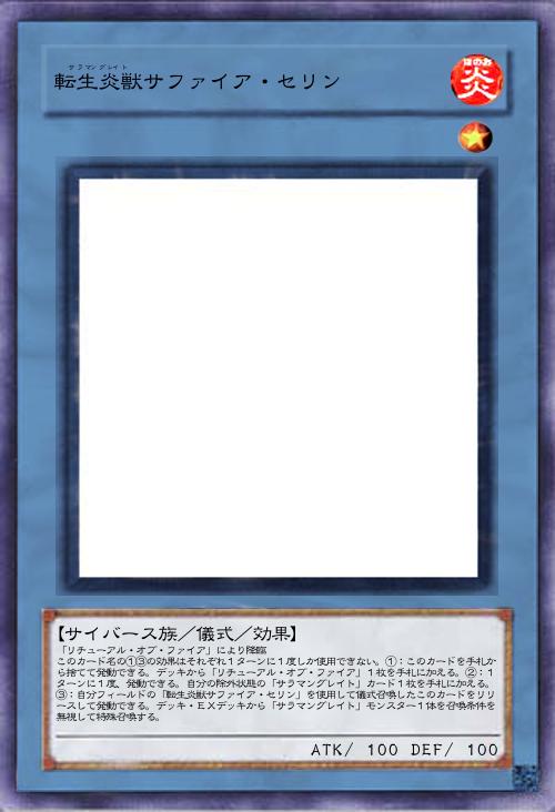 | 「リチューアル・オブ・ファイア」により降臨 このカード名の①③の効果はそれぞれ1ターンに1度しか使用できない。①:このカードを手札から捨てて発動できる。デッキから「リチューアル・オブ・ファイア」1枚を手札に加える。②:1ターンに1度、発動できる。自分の除外状態の「サラマングレイト」カード1枚を手札に加える。③:自分フィールドの「転生炎獣サファイア・セリン」を使用して儀式召喚したこのカードをリリースして発動できる。デッキ・EXデッキから「サラマングレイト」モンスター1体を召喚条件を無視して特殊召喚する。 | |||