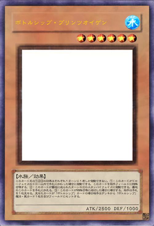 | このカード名の①②③の効果はそれぞれ1ターンに1度しか発動できない。①:このカードがドローフェイズのドロー以外で手札に加わった場合に発動できる。このカードを相手フィールドに特殊召喚する。②:このカードが墓地に送られたターンの次のスタンバイフェイズに発動できる。墓地のこのカードを手札に加える。③:このカードが特殊召喚に成功した場合に場合する。相手は手札を1枚見せる。見せたカードが「ボトルシップ」カードの場合相手はデッキから「ボトルシップ」魔法・罠カード1枚を自分フィールドにセットする。 | |||