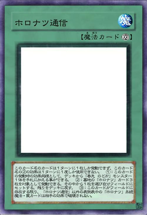 | このカード名のカードは1ターンに1枚しか発動できず、このカード名の②の効果は1ターンに1度しか使用できない。 ①:このカードの発動時の効果処理として、デッキから「春先 のどか」モンスター1体を手札に加える事ができる。 ②:墓地の「ホロナツ」カード3枚を対象として発動できる。その中から1枚を選び自分フィールドにセットする。残りをデッキに戻す。 ③:このカードがフィールドに存在する限り、「ホロナツ通信」以外の表側表示の「ホロナツ」永続魔法・罠カードは相手の効果で破壊されない。 | |||