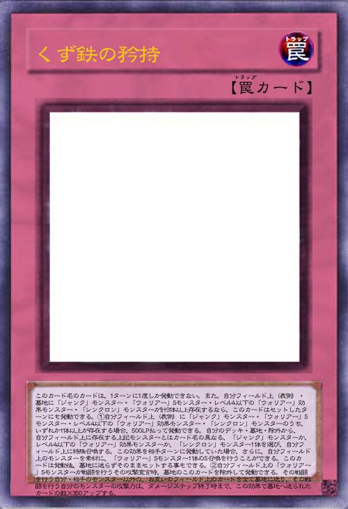 | このカード名のカードは、1ターンに1度しか発動できない。また、自分フィールド上(表側)・墓地に「ジャンク」モンスター・「ウォリアー」Sモンスター・レベル4以下の「ウォリアー」効果モンスター・「シンクロン」モンスターが計3体以上存在するなら、このカードはセットしたターンにも発動できる。①自分フィールド上(表側)に「ジャンク」モンスター・「ウォリアー」Sモンスター・レベル4以下の「ウォリアー」効果モンスター・「シンクロン」モンスターのうち、いずれか1体以上が存在する場合、500LP払って発動できる。自分のデッキ・墓地・除外から、自分フィールド上に存在する上記モンスターとはカード名の異なる、「ジャンク」モンスターか、レベル4以下の「ウォリアー」効果モンスターか、「シンクロン」モンスター1体を選び、自分フィールド上に特殊召喚する。この効果を相手ターンに発動していた場合、さらに、自分フィールド上のモンスターを素材に、「ウォリアー」Sモンスター1体のS召喚を行うことができる。このカードは発動後、墓地に送らずそのままセットする事もできる。②自分フィールド上の「ウォリアー」Sモンスターが戦闘を行うその攻撃宣言時、墓地のこのカードを除外して発動できる。その戦闘を行う自分・相手のモンスター以外の、お互いのフィールド上のカードを全て墓地に送り、その戦闘を行う自分のモンスターの攻撃力は、ダメージステップ終了時まで、この効果で墓地へ送られたカードの数×350アップする。 | |||