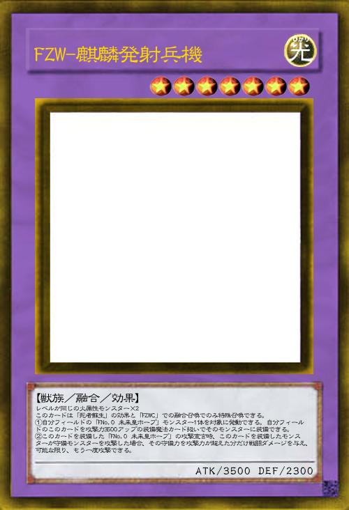 | レベルが同じの火属性モンスター×2 このカードは「死者蘇生」の効果と「FZWC」での融合召喚でのみ特殊召喚できる。 ①自分フィールドの「FNo.0 未来皇ホープ」モンスター1体を対象に発動できる。自分フィールドのこのカードを攻撃力3500アップの装備魔法カード扱いでそのモンスターに装備できる。 ②このカードを装備した「FNo.0 未来皇ホープ」の攻撃宣言時、このカードを装備したモンスターが守備モンスターを攻撃した場合、その守備力を攻撃力が超えた分だけ戦闘ダメージを与え、可能な限り、もう一度攻撃できる。 | |||