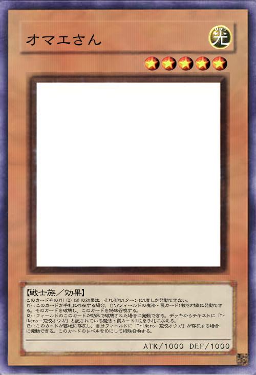 | このカード名の(1)(2)(3)の効果は、それぞれ1ターンに1度しか発動できない。 (1):このカードが手札に存在する場合、自分フィールドの魔法・罠カード1枚を対象に発動できる。そのカードを破壊し、このカードを特殊召喚する。 (2):フィールドのこのカードが効果で破壊された場合に発動できる。デッキからテキストに「TriNero-荒咬オウガ」と記されている魔法・罠カード1枚を手札に加える。 (3):このカードが墓地に存在し、自分フィールドに「TriNero-荒咬オウガ」が存在する場合に発動できる。このカードのレベルを10にして特殊召喚する。 | |||