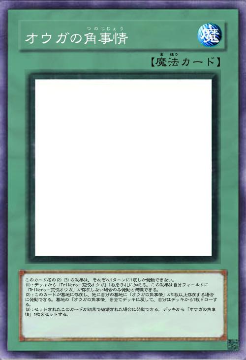| このカード名の(2)(3)の効果は、それぞれ1ターンに1度しか発動できない。 (1):デッキから「TriNero-荒咬オウガ」1枚を手札に加える。この効果は自分フィールドに「TriNero-荒咬オウガ」が存在しない場合のみ発動と処理できる。 (2):このカードが墓地に存在し、他に自分の墓地に「オウガの角事情」が2枚以上存在する場合に発動できる。墓地の「オウガの角事情」を全てデッキに戻して、自分はデッキから1枚ドローする。 (3):セットされたこのカードが効果で破壊された場合に発動できる。デッキから「オウガの角事情」1枚をセットする。 | |||