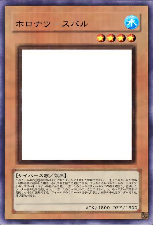 | このカード名の①③の効果はそれぞれ1ターンに1度しか使用できない。 ①:このカードが召喚・特殊召喚に成功した場合、手札2枚を捨てて発動できる。デッキからレベル3・4の「ホロナツ」モンスターを1体ずつ手札に加える。 ②:このカードがフィールドに存在する限り、自分はカウンター罠の効果を受けない。 ③:このカード以外の、自分の「ホロナツ」モンスターの効果が発動した場合に発動できる。フィールドのこのカードを手札に戻し、相手の手札をランダムで1枚選び墓地へ送る。 | |||