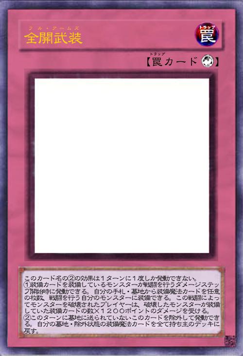 | このカード名の②の効果は1ターンに1度しか発動できない。 ①装備カードを装備しているモンスターが戦闘を行うダメージステップ開始時に発動できる。自分の手札・墓地から装備魔法カードを任意の枚数、戦闘を行う自分のモンスターに装備できる。この戦闘によってモンスターを破壊されたプレイヤーは、破壊したモンスターが装備していた装備カードの数×1200ポイントのダメージを受ける。 ②このターンに墓地に送られていないこのカードを除外して発動できる。自分の墓地・除外状態の装備魔法カードを全て持ち主のデッキに戻す。 | |||
