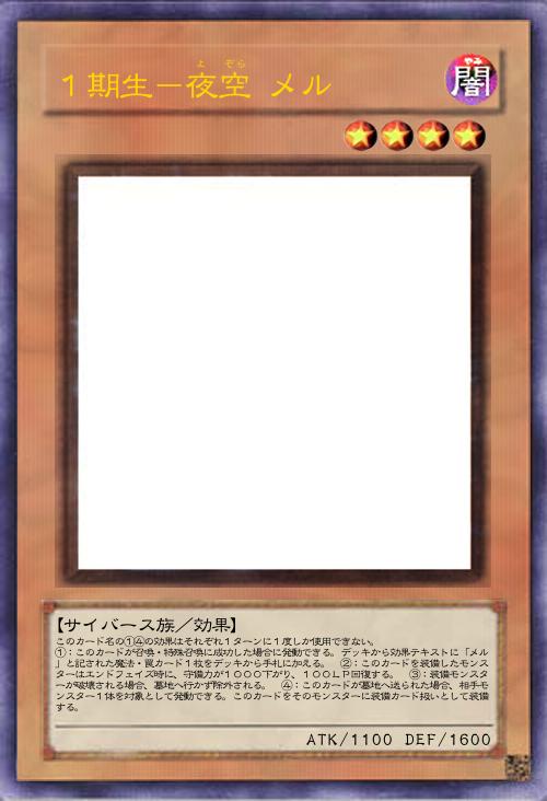 | このカード名の①④の効果はそれぞれ1ターンに1度しか使用できない。 ①:このカードが召喚・特殊召喚に成功した場合に発動できる。デッキから効果テキストに「メル」と記された魔法・罠カード1枚をデッキから手札に加える。 ②:このカードを装備したモンスターはエンドフェイズ時に、守備力が1000下がり、100LP回復する。 ③:装備モンスターが破壊される場合、墓地へ行かず除外される。 ④:このカードが墓地へ送られた場合、相手モンスター1体を対象として発動できる。このカードをそのモンスターに装備カード扱いとして装備する。 | |||