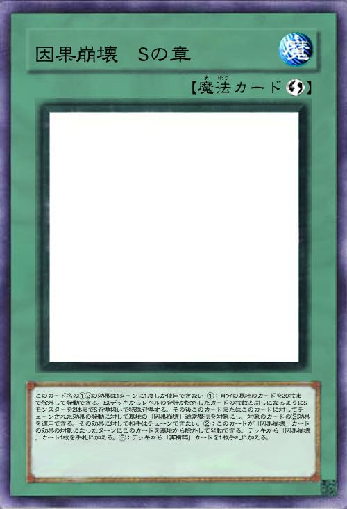 | このカード名の①②の効果は1ターンに1度しか使用できない ①:自分の墓地のカードを20枚まで除外して発動できる。EXデッキからレベルの合計が除外したカードの枚数と同じになるようにSモンスターを2体までS召喚扱いで特殊召喚する。その後このカードまたはこのカードに対してチェーンされた効果の発動に対して墓地の「因果崩壊」通常魔法を対象にし、対象のカードの③効果を適用できる。その効果に対して相手はチェーンできない。②:このカードが「因果崩壊」カードの効果の対象になったターンにこのカードを墓地から除外して発動できる。デッキから「因果崩壊」カード1枚を手札に加える。③:デッキから「再構築」カードを1枚手札に加える。 | |||