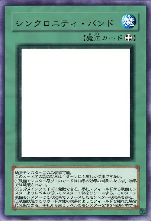 | 通常モンスターにのみ装備可能。 このカード名の②の効果は1ターンに1度しか使用できない。 ①装備モンスター及びこのカードは相手の効果の対象にならず、効果では破壊されない。 ②自分メインフェイズに発動できる。手札・フィールドから装備モンスターよりレベルの低いモンスター1体をリリースする。このターン装備モンスターはこの効果でリリースしたモンスターの効果を得る。 ③装備状態のこのカードが他の効果によってフィールドを離れた場合に発動できる。手札から同じレベルのモンスター2体を特殊召喚する。 | |||