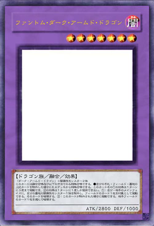 | 「ダーク・アームド・ドラゴン」+闇属性モンスター2体 このカードは融合召喚及び以下の方法でのみ特殊召喚できる。●自分の手札・フィールド・墓地の上記カードを除外した場合にEXデッキから特殊召喚できる。このカード名の①の効果は1ターンに3度まで発動でき、②の効果は1ターンに1度しか使用できない。①:自分・相手のメインフェイズに、自分の墓地の闇属性モンスター1体を除外し、フィールドのカード1枚を対象として発動できる。そのカードを破壊する。②:このカードが除外された場合に発動できる。相手フィールドのカード1枚を選んで破壊する。 | |||