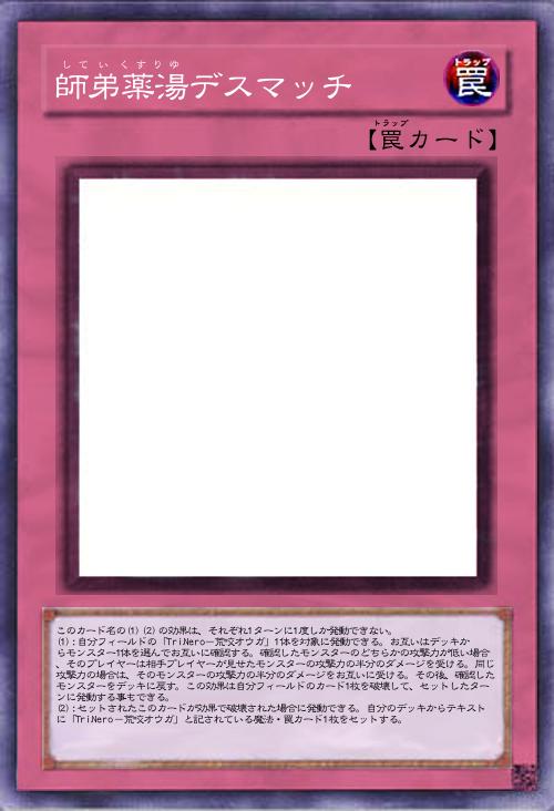 | このカード名の(1)(2)の効果は、それぞれ1ターンに1度しか発動できない。 (1):自分フィールドの「TriNero-荒咬オウガ」1体を対象に発動できる。お互いはデッキからモンスター1体を選んでお互いに確認する。確認したモンスターのどちらかの攻撃力が低い場合、そのプレイヤーは相手プレイヤーが見せたモンスターの攻撃力の半分のダメージを受ける。同じ攻撃力の場合は、そのモンスターの攻撃力の半分のダメージをお互いに受ける。その後、確認したモンスターをデッキに戻す。この効果は自分フィールドのカード1枚を破壊して、セットしたターンに発動する事もできる。 (2):セットされたこのカードが効果で破壊された場合に発動できる。自分のデッキからテキストに「TriNero-荒咬オウガ」と記されている魔法・罠カード1枚をセットする。 | |||