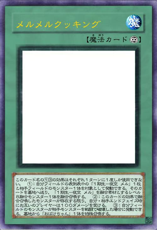| このカード名の①③の効果はそれぞれ1ターンに1度しか使用できない。 ①:自分フィールドの表側表示の「1期生-夜空 メル」1枚と相手フィールドのモンスター1体を対象として発動できる。そのカードを墓地へ送り、「1期生-夜空 メル」を融合素材とするレベル8融合モンスター1体を融合召喚する。 ②:このカードの効果で融合召喚したモンスターが存在する限り、自分・相手エンドフェイズ時にお互いのプレイヤーは100ダメージを受ける。 ③:自分フィールドのモンスターが相手モンスターを戦闘で破壊した場合に発動できる。墓地から「おばけちゃん」1体を特殊召喚する。 | |||