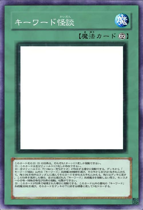 | このカード名の(2)(3)の効果は、それぞれ1ターンに1度しか発動できない。 (1):このカードは自分フィールドに1枚しか存在できない。 (2):自分フィールドに「TriNero-荒咬オウガ」が存在する場合に発動できる。デッキから「キーワード怪談」以外の「キーワード」永続魔法6種類を選び、その中から自分は1枚手札に加えて、残り2枚を相手はランダムに選んでそのカードを持ち主の手札に加える。残りはデッキに戻す。この効果を使用した場合、自分は選ばれた「キーワード」永続魔法を発動しない限り、モンスターの召喚・特殊召喚及び効果の発動、攻撃ができない。 (3):このカードが効果で破壊された場合に発動できる。このカード以外の墓地の「キーワード」永続魔法3枚を選び、そのカードをデッキの下に好きな順番に戻して1枚ドローする。 | |||