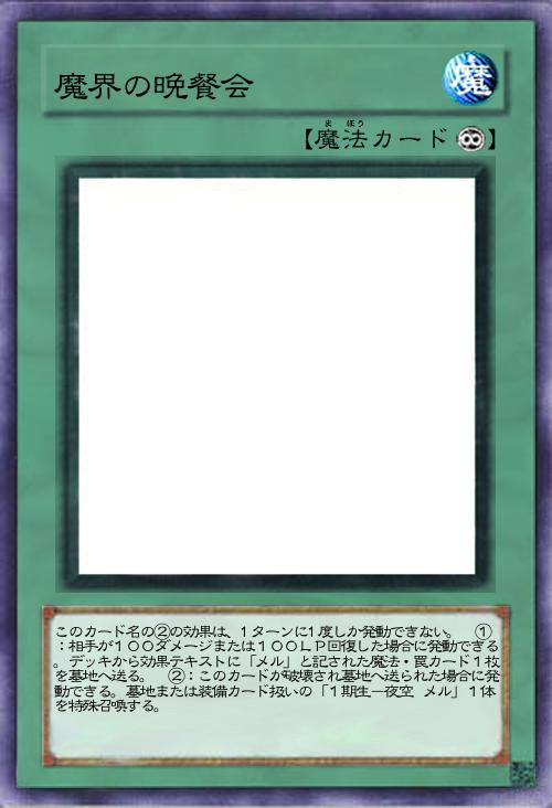 | このカード名の②の効果は、1ターンに1度しか発動できない。 ①:相手が100ダメージまたは100LP回復した場合に発動できる。デッキから効果テキストに「メル」と記された魔法・罠カード1枚を墓地へ送る。 ②:このカードが破壊され墓地へ送られた場合に発動できる。墓地または装備カード扱いの「1期生-夜空 メル」1体を特殊召喚する。 | |||