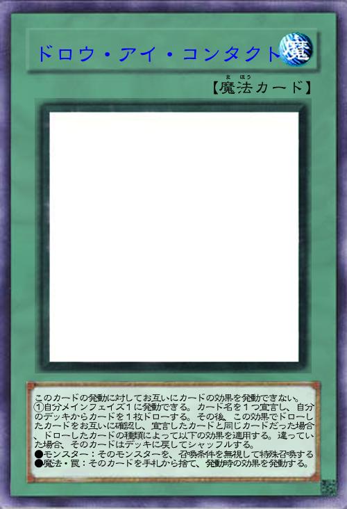 | このカードの発動に対してお互いにカードの効果を発動できない。 ①自分メインフェイズ1に発動できる。カード名を1つ宣言し、自分のデッキからカードを1枚ドローする。その後、この効果でドローしたカードをお互いに確認し、宣言したカードと同じカードだった場合、ドローしたカードの種類によって以下の効果を適用する。違っていた場合、そのカードはデッキに戻してシャッフルする。 ●モンスター:そのモンスターを、召喚条件を無視して特殊召喚する ●魔法・罠:そのカードを手札から捨て、発動時の効果を発動する。 | |||