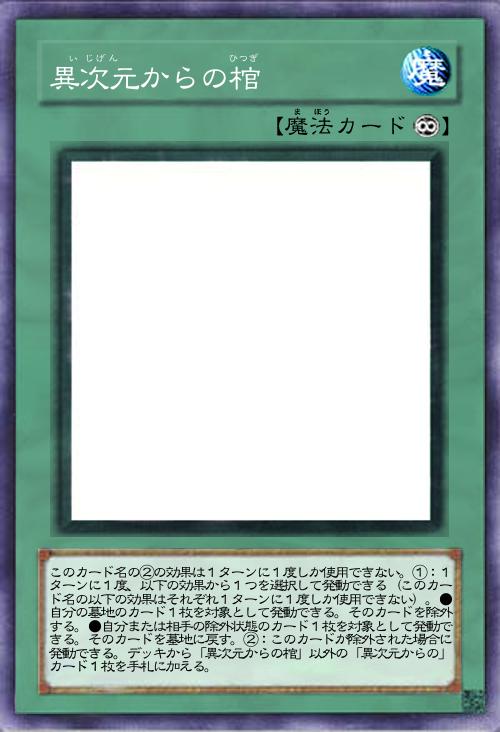 | このカード名の②の効果は1ターンに1度しか使用できない。①:1ターンに1度、以下の効果から1つを選択して発動できる(このカード名の以下の効果はそれぞれ1ターンに1度しか使用できない)。●自分の墓地のカード1枚を対象として発動できる。そのカードを除外する。●自分または相手の除外状態のカード1枚を対象として発動できる。そのカードを墓地に戻す。②:このカードが除外された場合に発動できる。デッキから「異次元からの棺」以外の「異次元からの」カード1枚を手札に加える。 | |||
