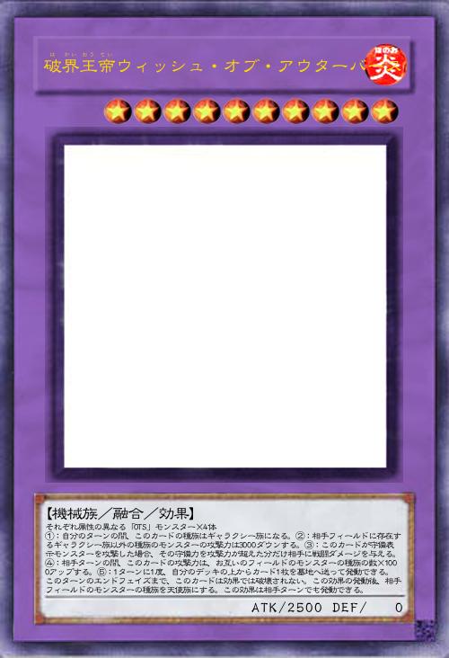 | それぞれ属性の異なる「OTS」モンスター×4体 ①:自分のターンの間、このカードの種族はギャラクシー族になる。②:相手フィールドに存在するギャラクシー族以外の種族のモンスターの攻撃力は3000ダウンする。③:このカードが守備表示モンスターを攻撃した場合、その守備力を攻撃力が超えた分だけ相手に戦闘ダメージを与える。④:相手ターンの間、このカードの攻撃力は、お互いのフィールドのモンスターの種族の数×1000アップする。⑤:1ターンに1度、自分のデッキの上からカード1枚を墓地へ送って発動できる。このターンのエンドフェイズまで、このカードは効果では破壊されない。この効果の発動後、相手フィールドのモンスターの種族を天使族にする。この効果は相手ターンでも発動できる。 | |||