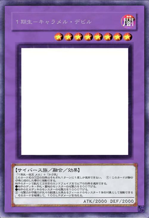 | 「1期生-夜空 メル」+「かぷ民」 このカード名の①②の効果はそれぞれ1ターンに1度しか使用できない。 ①:このカードが融合召喚に成功した場合に発動できる。 相手のターンで数えて2回目のエンドフェイズまで以下の効果を適用できる。 ●相手のデッキ・手札・墓地のモンスターの攻撃力を500下げる。 ●相手のEXデッキのモンスターの攻撃力を1000下げる。 ②:攻撃力か守備力が元々の数値とは異なるフィールドのモンスター1体を対象として発動できる。そのカードを破壊して、100LPダメージを与える。 | |||