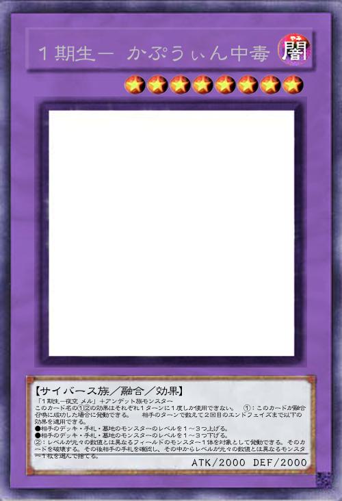 | 「1期生-夜空 メル」+アンデット族モンスター このカード名の①②の効果はそれぞれ1ターンに1度しか使用できない。 ①:このカードが融合召喚に成功した場合に発動できる。 相手のターンで数えて2回目のエンドフェイズまで以下の効果を適用できる。 ●相手のデッキ・手札・墓地のモンスターのレベルを1~3つ上げる。 ●相手のデッキ・手札・墓地のモンスターのレベルを1~3つ下げる。 ②:レベルが元々の数値とは異なるフィールドのモンスター1体を対象として発動できる。そのカードを破壊する。その後相手の手札を確認し、その中からレベルが元々の数値とは異なるモンスター1枚を選んで捨てる。 | |||
