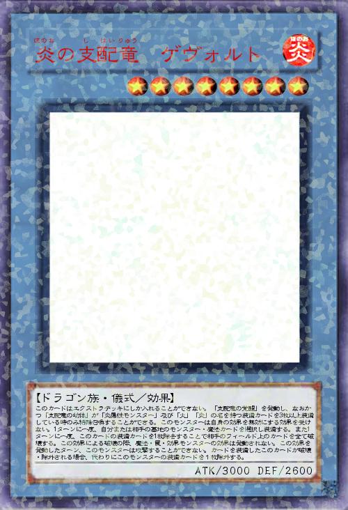 | このカードはエクストラデッキにしか入れることができない。「支配竜の覚醒」を発動し、なおかつ「支配竜の幼体」が「炎属性モンスター」及び「火」「炎」の名を持つ装備カードを3枚以上装備している時のみ特殊召喚することができる。このモンスターは自身の効果を無効にする効果を受けない。1ターンに一度、自分または相手の墓地のモンスター・魔法カードを選択し装備する。また1ターンに一度、このカードの装備カードを1枚除去することで相手のフィールド上のカードを全て破壊する。この効果による破壊の際、魔法・罠・効果モンスターの効果は発動されない。この効果を発動したターン、このモンスターは攻撃することができない。カードを装備したこのカードが破壊・除外される場合、代わりにこのモンスターの装備カードを1枚除外する。 | |||