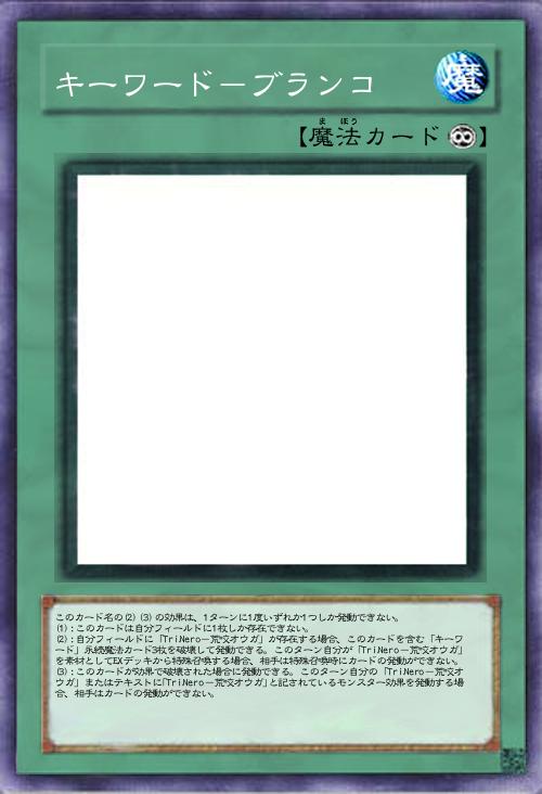 | このカード名の(2)(3)の効果は、1ターンに1度いずれか1つしか発動できない。 (1):このカードは自分フィールドに1枚しか存在できない。 (2):自分フィールドに「TriNero-荒咬オウガ」が存在する場合、このカードを含む「キーワード」永続魔法カード3枚を破壊して発動できる。このターン自分が「TriNero-荒咬オウガ」を素材としてEXデッキから特殊召喚する場合、相手は特殊召喚時にカードの発動ができない。 (3):このカードが効果で破壊された場合に発動できる。このターン自分の「TriNero-荒咬オウガ」またはテキストに「TriNero-荒咬オウガ」と記されているモンスター効果を発動する場合、相手はカードの発動ができない。 | |||