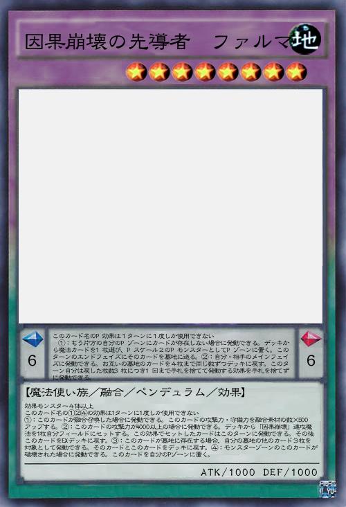 | 効果モンスター4体以上 このカード名の①②④の効果は1ターンに1度しか使用できない ①:このカードが融合召喚した場合に発動できる。このカードの攻撃力・守備力を融合素材の数×500アップする。②:このカードの攻撃力が4000以上の場合に発動できる。デッキから「因果崩壊」速攻魔法を1枚自分フィールドにセットする。この効果でセットしたカードはこのターンに発動できる。その後このカードをEXデッキに戻す。③:このカードが墓地に存在する場合、自分の墓地の他のカード3枚を対象として発動できる。そのカードとこのカードをデッキに戻す。④:モンスターゾーンのこのカードが破壊された場合に発動できる。このカードを自分のPゾーンに置く。 | |||