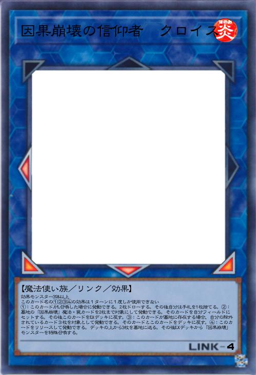 | 効果モンスター3体以上 このカード名の①②③④の効果は1ターンに1度しか使用できない ①:このカードがL召喚した場合に発動できる。2枚ドローする。その後自分は手札を1枚捨てる。②:墓地の「因果崩壊」魔法・罠カードを2枚まで対象にして発動できる。そのカードを自分フィールドにセットする。その後このカードをEXデッキに戻す。③:このカードが墓地に存在する場合、自分の除外されているカード3枚を対象として発動できる。そのカードとこのカードをデッキに戻す。④:このカードをリリースして発動できる。デッキの上から3枚を墓地に送る。その後EXデッキから「因果崩壊」モンスターを特殊召喚する。 | |||