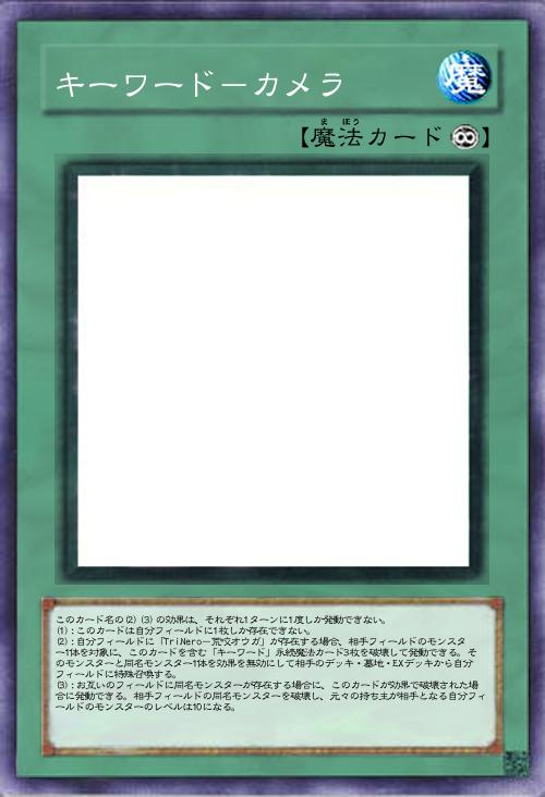 | このカード名の(2)(3)の効果は、それぞれ1ターンに1度しか発動できない。 (1):このカードは自分フィールドに1枚しか存在できない。 (2):自分フィールドに「TriNero-荒咬オウガ」が存在する場合、相手フィールドのモンスター1体を対象に、このカードを含む「キーワード」永続魔法カード3枚を破壊して発動できる。そのモンスターと同名モンスター1体を効果を無効にして相手のデッキ・墓地・EXデッキから自分フィールドに特殊召喚する。 (3):お互いのフィールドに同名モンスターが存在する場合に、このカードが効果で破壊された場合に発動できる。相手フィールドの同名モンスターを破壊し、元々の持ち主が相手となる自分フィールドのモンスターのレベルは10になる。 | |||